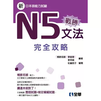 內容簡介 2010年新制日語檢定試驗正式登場,面對全新制度的範圍及題型,「戰勝N5文法完全攻略」提供準確的命題取向與重點,幫助讀者順利獲取高分。 筆者針對新制檢定N5級「文法」內容,參酌日本國際交流基金會及日本國際教育協會合著「日本語能力試驗出題基準」,與歷年日檢4級試題,並融入其多年教學經驗,在新制日語檢定架構下,進行編排分類,力求內容簡明清晰,輔以對應之充足而完整的題型,以期順利又有效地奠定讀者良好的日語文法基礎。