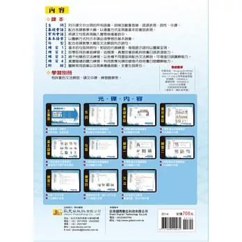 本書專為商科學習者編輯而成,適用於每週授課2~4小時第二個學年。內容豐富、附錄實用、全書彩色印刷,各課配合教學大綱,以漫畫方式呈現最基本的會話表現,以圖解方式列示各課基本語彙,配合各課內容列示語句,並提供基本句型的代換練習、即學即用的會話練習、絕不枯燥的文法練習、真實臨場的聽力練習等。本教材附有多媒體教材光碟,配合多元學習工具,學習者可依自己的需求選擇搭配使用。