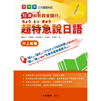 |   | 日中英超特急說日語 中上級篇特惠價 網友評鑑4.5顆星 最近好多網友都在問哪裡買 博客來語言學習-日本語分類優質好書 想了解更多[日中英超特急說日語 中上級篇]的內容嗎 點圖即可看詳細介紹 |