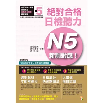 《新制對應 絕對合格!日檢聽力N5》的高分解題法,徹底分析舊制及新制考古題,幫您精闢分析解題技巧,破解出題老師的命題方向,讓您對任何題都能型迎刃而解,提升成績立竿見影!
