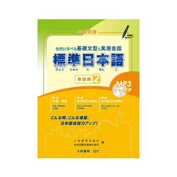 本書是與「中日交流標準日本語」配套的會話教材,為「中日交流標準日本語會話篇」的第2冊。學習者可搭配第1冊,先奠定發音基礎,熟悉發音後再進入會話,以收完整學習功效。本書包含實用道地的日常會話內容,以及豐富的單字和句型練習,以達瞭解並活用的目標。跟著本書聽說讀寫,學習標準日本語!