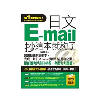 必須每天用日文E-mail聯繫客戶,而且日籍客戶的嚴謹要求,總是讓你缺乏自信不知該怎麼動筆寫Mail的人,現在千萬別再困愁城找不出方法,完成一封日文E-mail真的只需彈指之間,一本「日文E-mail,抄這本就夠了」不但讓你書寫E-mail時表達的語句讓客戶刮目相看、展現的超高工作效率更讓老闆大力激賞。