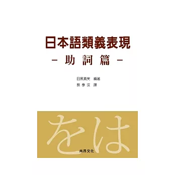 這本「日本語類義表現-助詞篇-」裡,提出了與文法.句型相關的類義表現,共有77項。依照「□□□□、「有關格助詞」、「有關接續助詞」、「有關副助詞」、「有關接尾語」的順序排列。此外,筆者認為對類義表現如果只做說明的話,有稍嫌不足之感,故針對比較難以區分的項目配置了例題。透過對例題實際做解答,來測試自己是否已真正地瞭解。這些例題是當初為了測試學習者的理解程度,於課堂中所製作出來的題目。本書卷首附有索引,方便使用者查閱。
