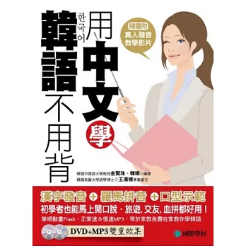 所以,我們理解了韓語愛好者在學習韓語過程中的困難點,針對這些困難點,一一找出解決的方法,推出了這本專為零基礎者編寫的韓語入門書《用中文學韓語不用背》,對於特殊的「漢字讀音拼讀法」,只要跟著韓籍老師的發音教學影片、筆順Flash、跟讀MP3...學習,讓您一開口就是最道地標準的首爾音。「口語短句篇、場景會話篇」也收錄生活中使用最多、最頻繁的例子,跟著本書學習,一定能達到「馬上就能開口說」的程度,不管是和韓國人談話、旅遊、看韓劇......都能流利地用韓語進行交流。