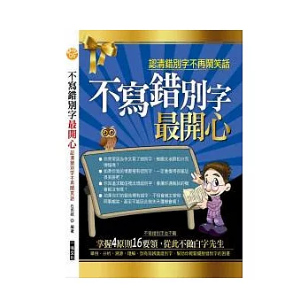 4.本書一方面減輕閱讀的枯燥感,另一方面幫助讀者達到強化記憶和自我檢查的效果,讓讀者在潛移默化中,輕輕鬆鬆達到舉一反三的效果,藉不斷地練習做到最正確的「認知」,讓讀者在不知不覺中,把錯別字消滅得乾乾淨淨。